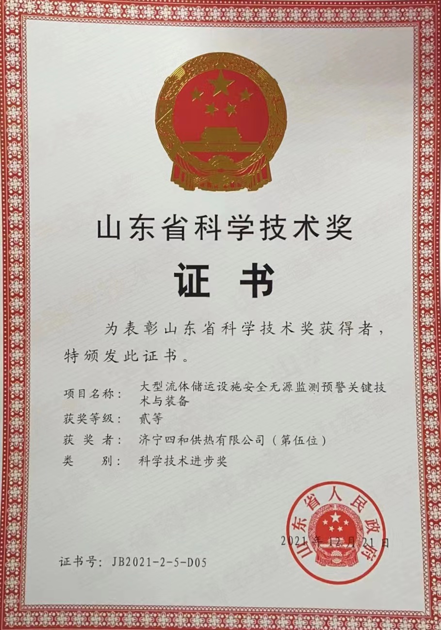 創(chuàng)新驅(qū)動發(fā)展、技術(shù)制勝未來。近日,山東省人民政府發(fā)布《關(guān)于2021年山東省科學(xué)技術(shù)獎勵的決定》,正式公布山東省科學(xué)技術(shù)獎獲獎名單,對為山東省科學(xué)技術(shù)進(jìn)步、經(jīng)濟(jì)社會發(fā)展作出突出貢獻(xiàn)的科學(xué)技術(shù)人員和組織給予獎勵。濟(jì)寧四和供熱有限公司參與完成的“大型流體儲運(yùn)設(shè)施安全無源監(jiān)測預(yù)警關(guān)鍵技術(shù)與裝備”項(xiàng)目名列其中,榮獲“山東省科學(xué)技術(shù)獎二等獎”。
